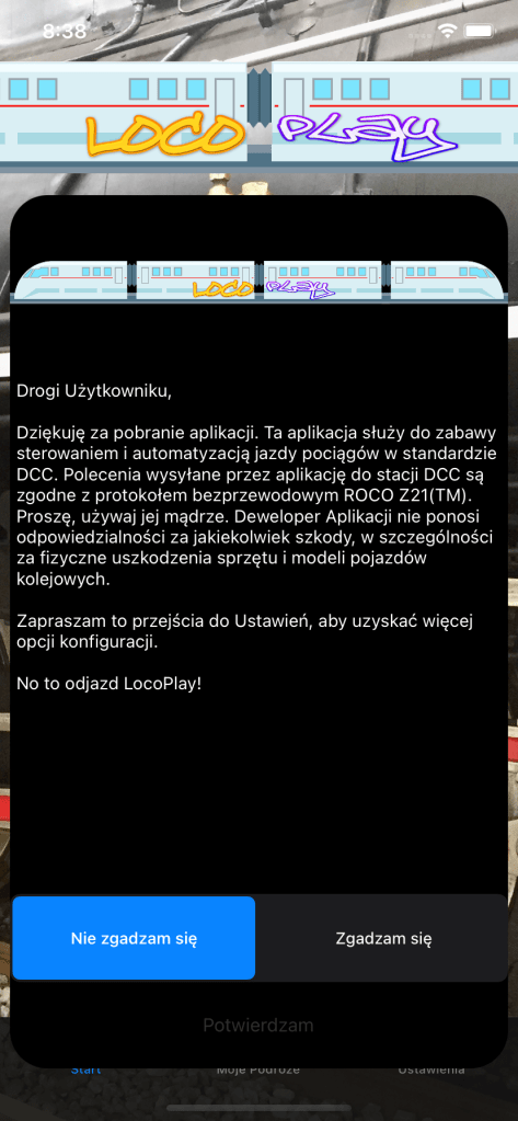 Przy pierwszym uruchomieniu Aplikacji zostaniesz poproszony o zaakceptowanie warunków użytkowania. Następnie możesz przejść do Ustawień, aby skonfigurować połączenie ze stacją DCC kompatybilną z Z21(TM).