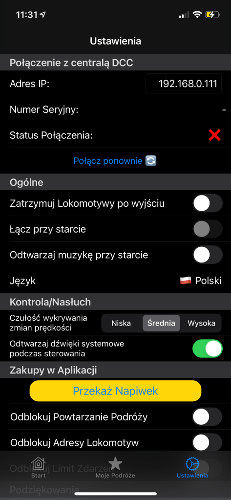 Po nawiązaniu połączenia z Wi-Fi wróć do ustawień LocoPlay i upewnij się, że adres IP jest poprawny; dla Z21 domyślny IP = 192.168.0.111 (dla Raibox może być 192.168.4.111), chyba, że ustawiłeś własny. Możesz edytować adres IP, a następnie nacisnąć „Połącz ponownie”.