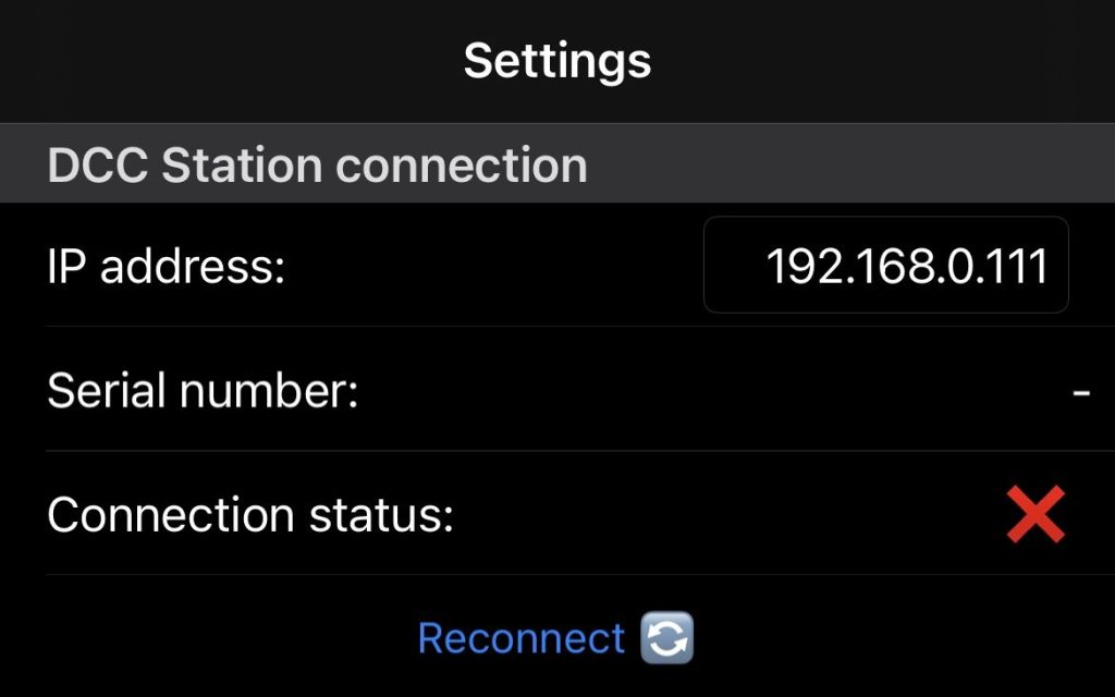 Once you’re connected to the WiFi, go back to the LocoPlay Settings and make sure that the IP address is correct; for Z21 the default IP = 192.168.0.111 (For Raibox could be 192.168.4.111) unless you had set your own. You can edit the IP and then press “Reconnect”. Once successfully connected the Connection status will change to green and the DCC station’s Serial number will be shown.