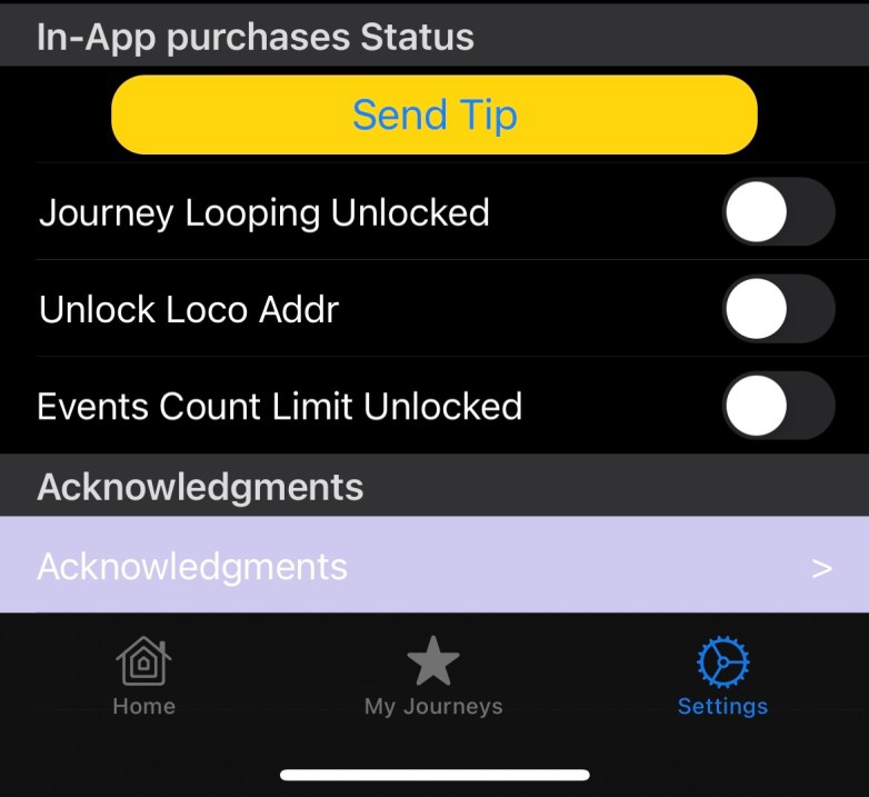 - Stop Locos on Exit – When you exit LocoPlay by going to the main iPhone screen or switch to another app, this option forces emergency stop for all loco addresses that are a part of a Journey being played, recorded or edited.