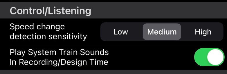 - Speed change detection sensitivity – while recording a Journey in Control and Record Center, you swipe the speed control to increase or decrease the train speed. The sensitivity means how much the speed should change, from the currently last recorded speed value, to be recorded as an Event in a Journey. The same pertains to listening for incoming speed changes invoked by external controlers for Locos in a Listen mode.