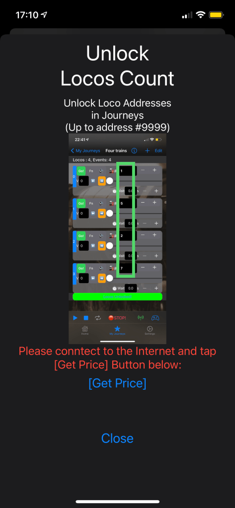 - Unlock Loco Addr – Initially you may use up to 2 loco addresses in a single Journey. E.g. #1 and #2 or #10 and #99 as long as among Events there are only 2 addresses being used. After unlocking you may use more than 2 addresses per Journey, even each Event may have a differet address.
