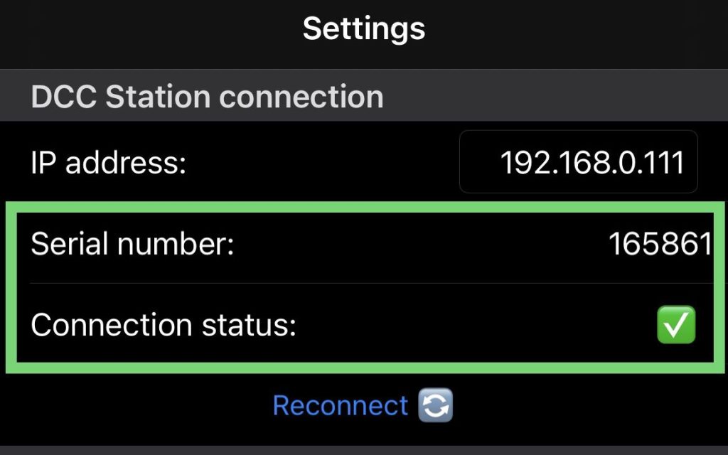 Po nawiązaniu połączenia z Wi-Fi wróć do ustawień LocoPlay i upewnij się, że adres IP jest poprawny; dla Z21 domyślny IP = 192.168.0.111 (dla Raibox może być 192.168.4.111), chyba że ustawiłeś własny. Możesz edytować adres IP, a następnie nacisnąć „Połącz ponownie”.