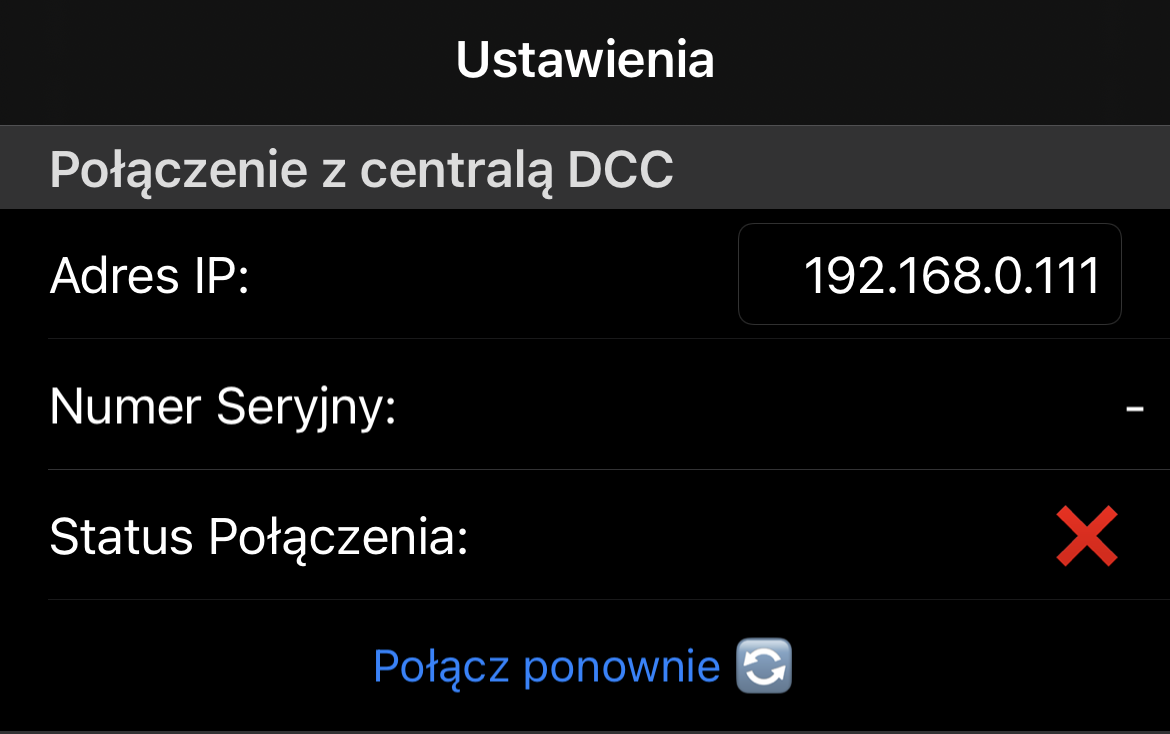 - Połączenie z centralą DCC – umożliwienie ustawienia adresu IP i ponowne połączenie