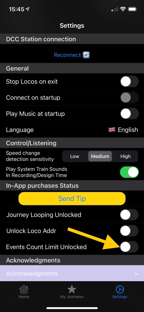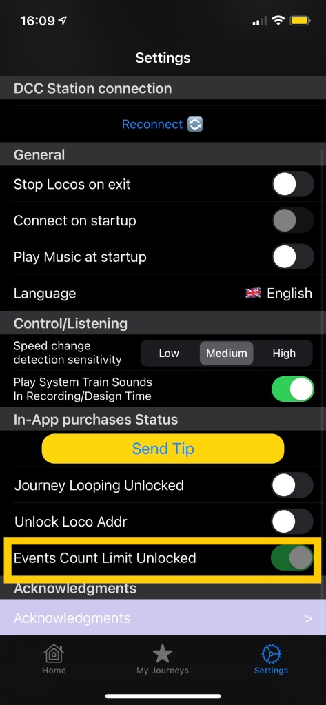 - Odtwarzaj dźwięki systemowe pociągów podczas sterowania — aplikacja LocoPlay posiada wbudowane przykładowe dźwięki, które można odtwarzać jako zdarzenia w podróży. Ta funkcja jest przydatna, jeśli nie masz dekodera dźwięku w swojej lokomotywie. Ustawienie włącza/wyłącza odtwarzanie dźwięku po naciśnięciu odpowiedniego przycisku w Centrum sterowania i nagrywania lub podczas ręcznego dodawania zdarzeń.
