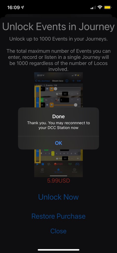 Teraz możesz potwierdzić swój zakup. Po pomyślnym przetworzeniu aplikacja poinformuje Cię, że możesz ponownie połączyć się z centralką Z21 DCC.